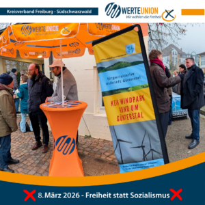 Deshalb gilt für alle Wahlberechtigten in Baden-Württemberg: Am 8. März 2026 muss Grün-Schwarz endlich abgewählt werden. Kein weiterer Windkraftausbau in Baden-Württemberg! Für ein Baden-Württemberg mit Vernunft statt Ideologie, mit dauerhaft verlässlicher und kostengünstiger Energieversorgung braucht es eine starke WerteUnion!